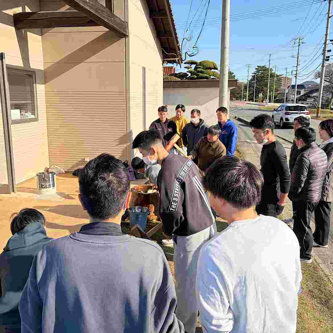 当日は、風が強いなかでの餅つきとなりましたが、労福協会員や施設の方々と協力しながら餅つきを行い、休憩では、大根餅や豚汁を振る舞っていただきました。